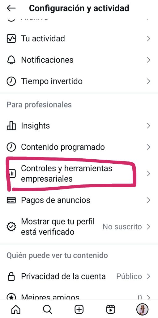 Si ya tienes tu cuenta como profesional, puedes cambiarla a Creador y viceversa en: Configuración < Controles y herramientas empresariales/creador.